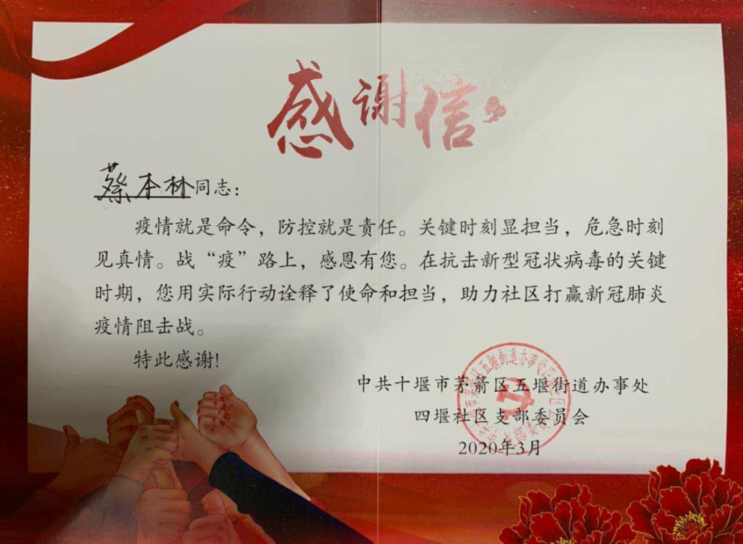 春节期间,疫情越来越严重,各级防疫指挥部接连下发抗疫防控指导文件,所在街道、社区和业委会也很快行动起来了,大家都意识到了事态的严重性,于大年三十23时封城后就开始筹划防疫防控具体措施,由于事出突然,地处疫区偏远山区,虽物业组织采购了一批应急物资,但随着疫情爆发,杯水车薪,尽管物资极度紧缺,但一线防护物资必须要跟上,这个棘手问题就立马凸显出来,最后决定由业委会出面组织、热心业主(旅游协会会长)牵头负责抗疫物资募捐活动和组建小区门岗卡口志愿者服务组,蔡本林听闻后第一个报名参加志愿者服务组并带头捐款1100元整,用于购买消毒液、医用口罩等日常防护物资,同时在十堰头条网等知名媒体募捐版面参与捐款活动,呼吁周围人群积极响应国家号召,“有钱出钱、有力出力”,共同抵御新冠疫情,打好阻击战,夺得攻坚战的最终胜利。