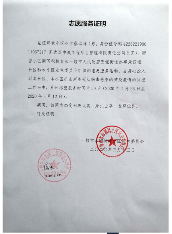 蔡本林,武汉中澳工程项目管理有限责任公司一名普通的水运总监理工程师,今年回家过年,恰遇突如其来的新型冠状病毒肆虐,在所居住社区居民最需要,其时也是自家最需要的时候,冲到家乡一线参与抗疫防控工作。